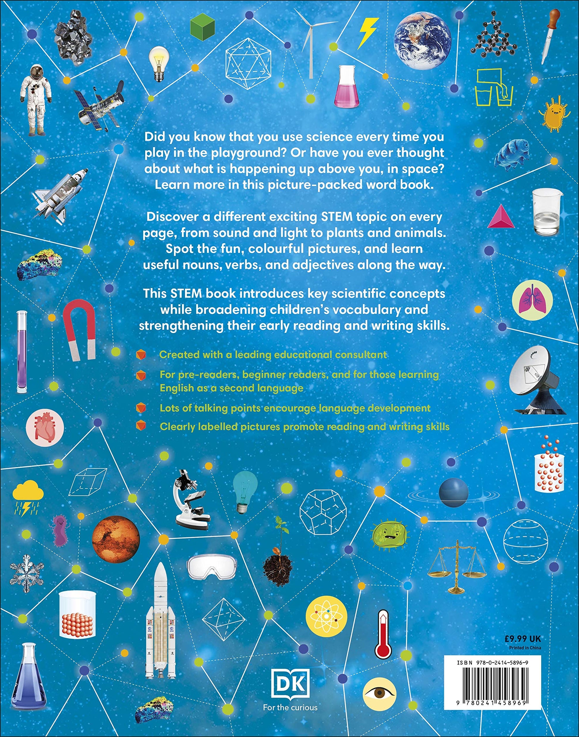 Encourage Early Science, Vocabulary and Literacy Skills Discover a different and exciting STEM (science, technology, engineering and mathematics) topic on every page of this science book for kids! Delve into the key scientific concepts from sound and light to plants and animals. It's the perfect gift for children who are curious about science and keep asking the how and why questions!Use picture-and-word association to learn about STEM topics like:- Seasons, the weather, and why things get hot and cold- Machines, materials, and junk- Being at the doctor and inside the human body- Vehicles, transport, the moon landing, and much moreIntroduce key scientific concepts to your child and encourage early reading, writing and vocabulary skillsDid you know that science is all around us, even on the playground?
