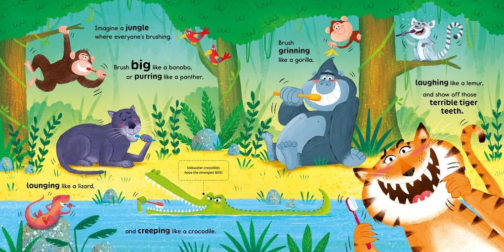 You can brush them balancing on one leg like a pink flamingo. You can brush them with a pal, like a crocodile. You can brush them while you ROAR like a lion.