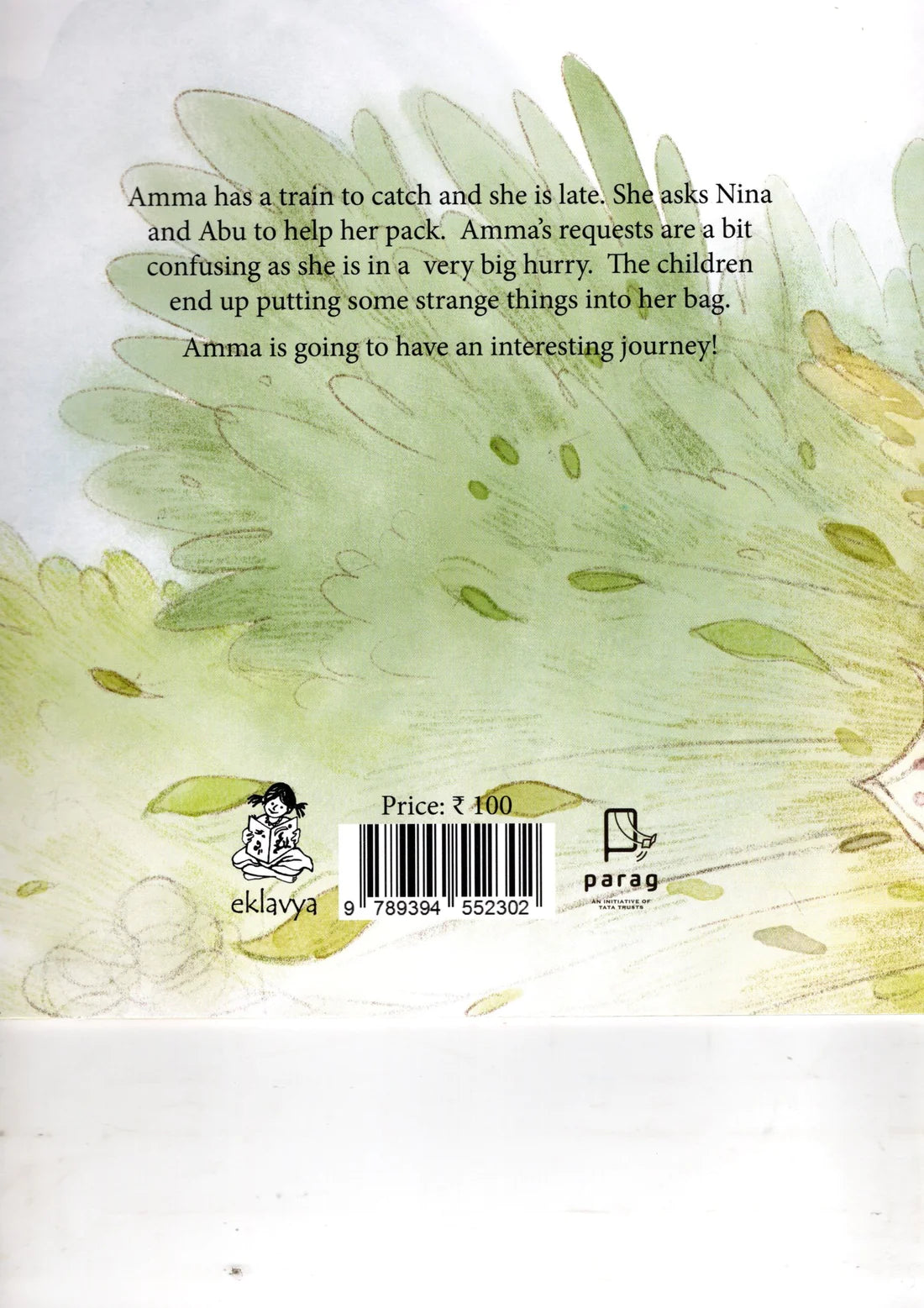 Amma has a train to catch and she is late. She ask Nina and Abu to Help her pack. Amma's requests are bit confusing as she is in a very big hurry. The children end up putting some strange things into her bag.
