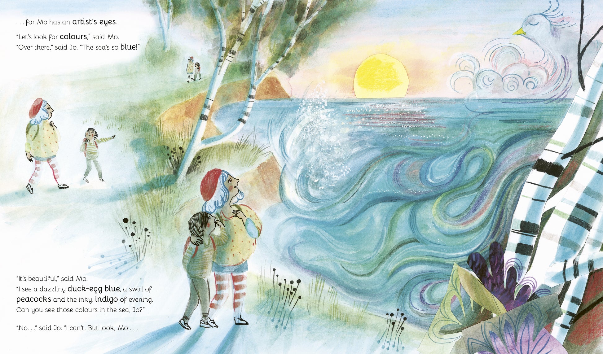 From the autumn oranges of the forest floor to pink and lilac pigeons in flight, Mo teaches Jo to trust his own eyes, and to see like an artist.