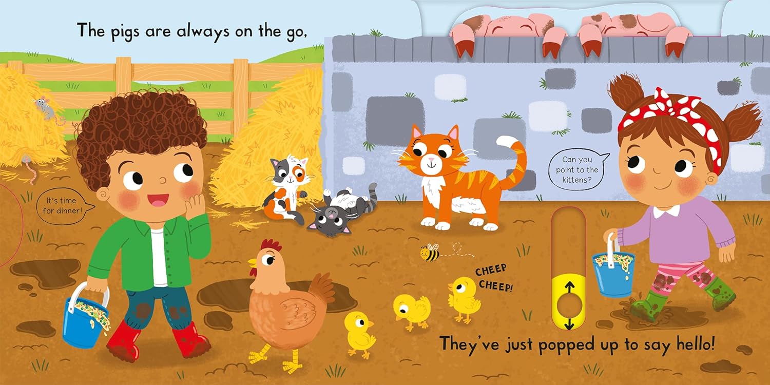 Push, pull and slide the tabs to learn all about life on the Busy Farm! Meet all the different animals, help the farmer bale the hay and join in rounding up the sheep at bedtime.