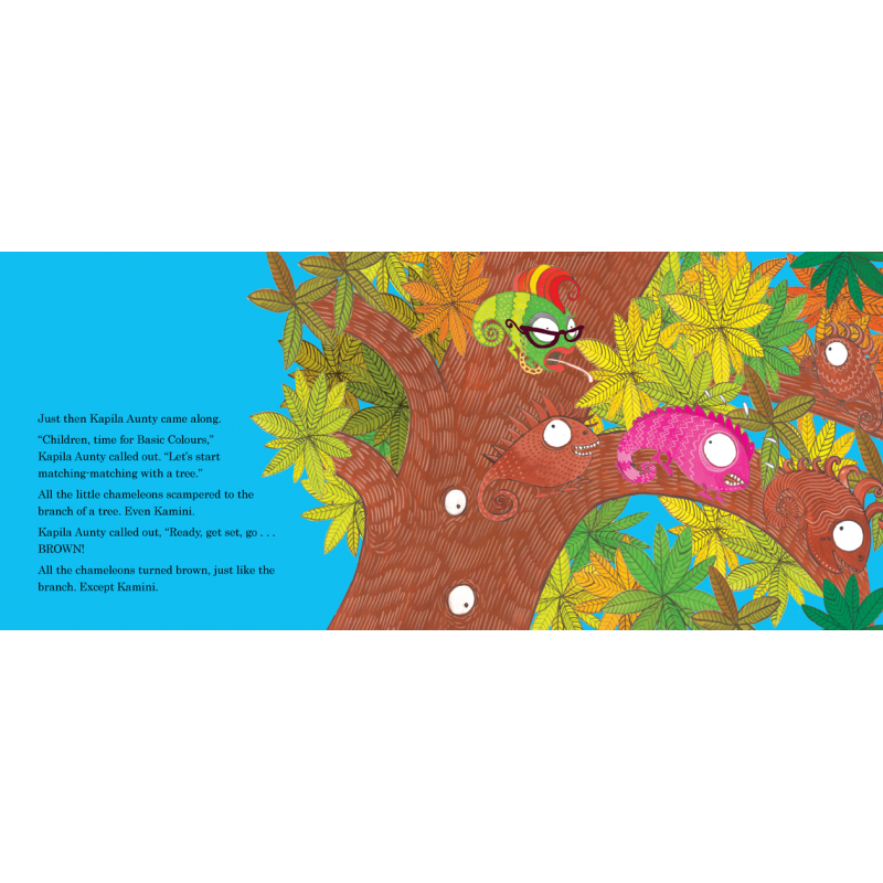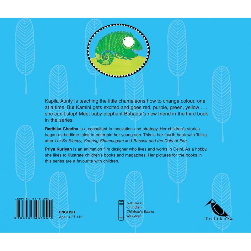 Kapila Aunty is teaching the little chameleons how to change colour, one at a time. But Kamini gets excited and goes red, purple, green, yellow . . . she just can’t stop! The flashy-splashy third story in the ever popular series about Bahadur the baby elephant!