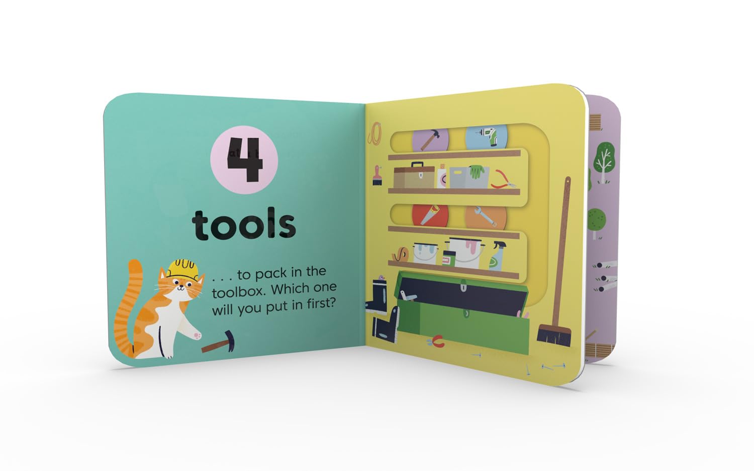 Find cute and colourful counters to move and simple prompts to follow along all the way through this chunky and satisfying new board book. Can you count the tools as you pack them into their box? Don’t forget to drive the trucks!