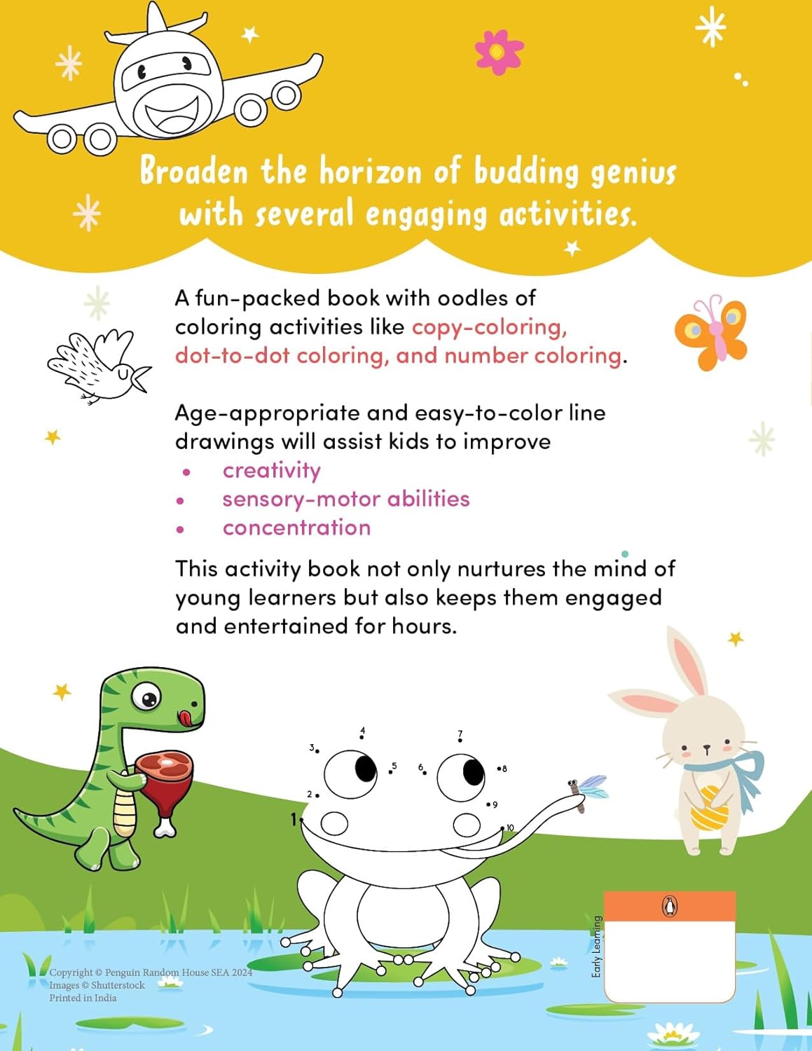 A fun-packed book with oodles of coloring activities like copy-coloring, dot-to-dot coloring, and number coloring.