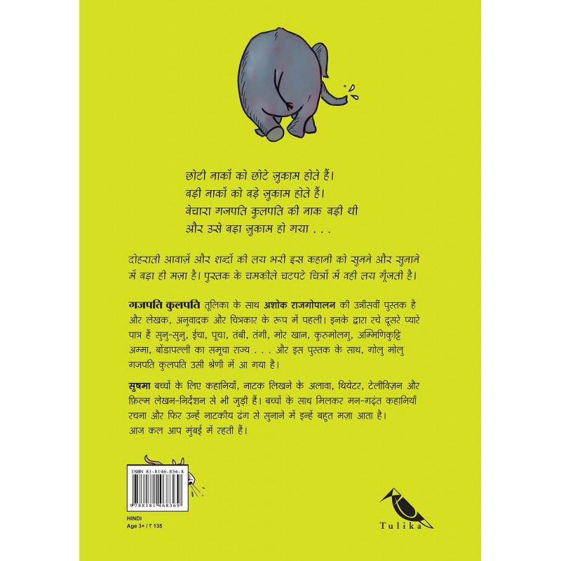 Small noses catch small colds. Big noses catch big colds. Gajapati Kulapati the elephant has a big nose and catches a great, big, mighty cold! And what happens when he sneezes – Aaaaachoooo….? With repetitive sounds and words that roll rhythmically through the pages, this bestselling series about the adorable elephant puts the zing back into storytelling and reading aloud. Bright, zestful pictures and dynamic visual text echo the lilt, making these big, happy books of fun. 2018: Best of Indian Children's Writing: