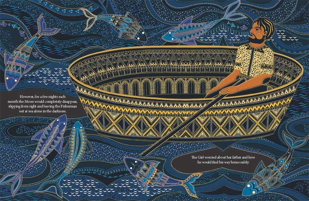 This beautifully illustrated story gives us a new folk tale and a new way to look up at the night sky. The fisherman's daughter loved to dance in the Sunlight, and bathe in the glow of the Moon, but when the Moon would disappear for a few nights each month, she would worry about her father and how he would find his way home from sea in the deep darkness. When the Sun finds her sobbing one night, he takes one of his rays and smashes it onto the ground, creating the stars and giving the girl the task of putting them into the dark night sky.