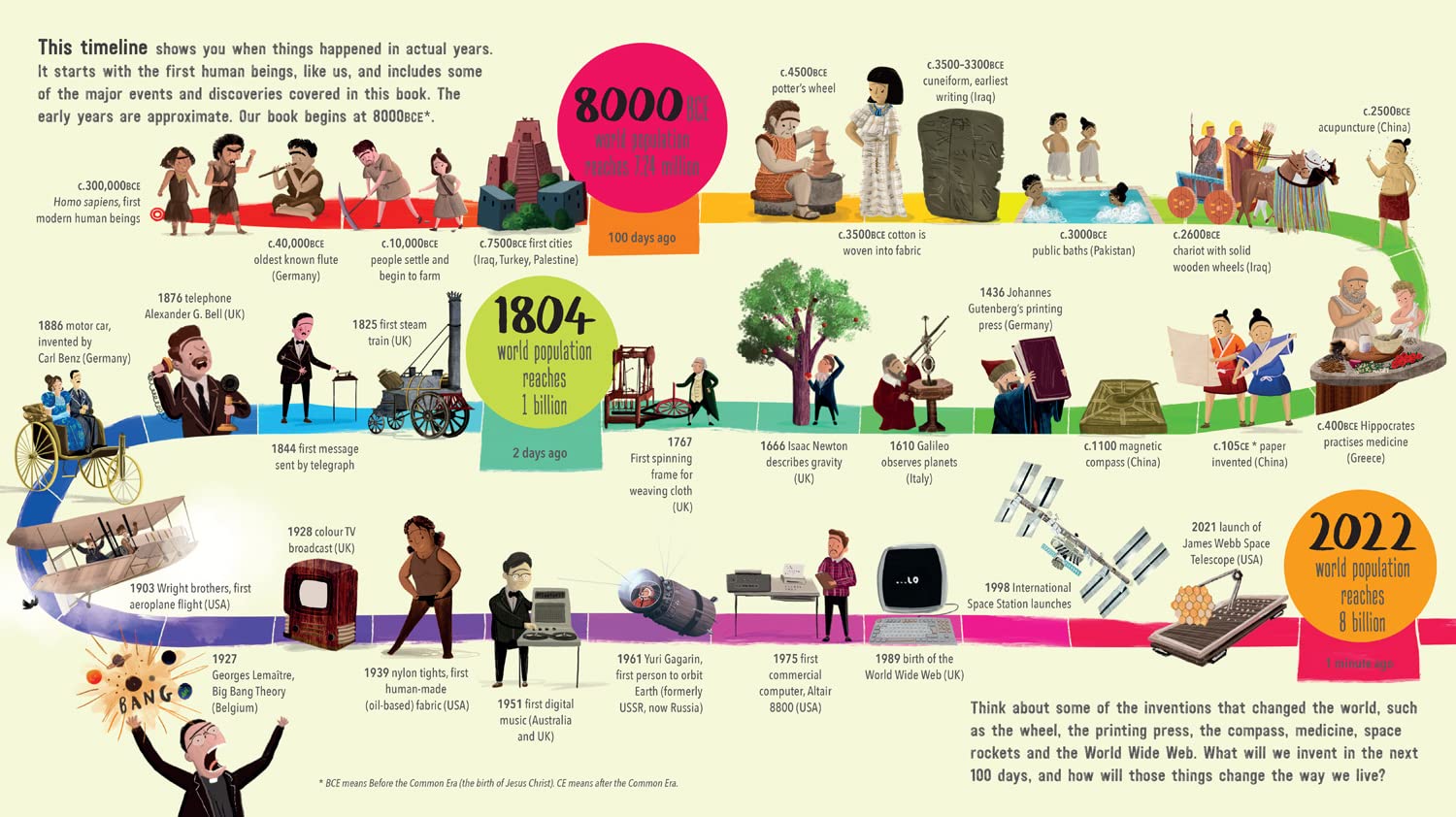 But 10,000 years ago is difficult to imagine – what if our calendar were condensed into just 100 days, where each day equals 100 years? How many days ago were the first cities built? When did the population explosion happen? When did we decide to write things down and when did books appear? Did writing change the way we share ideas?
