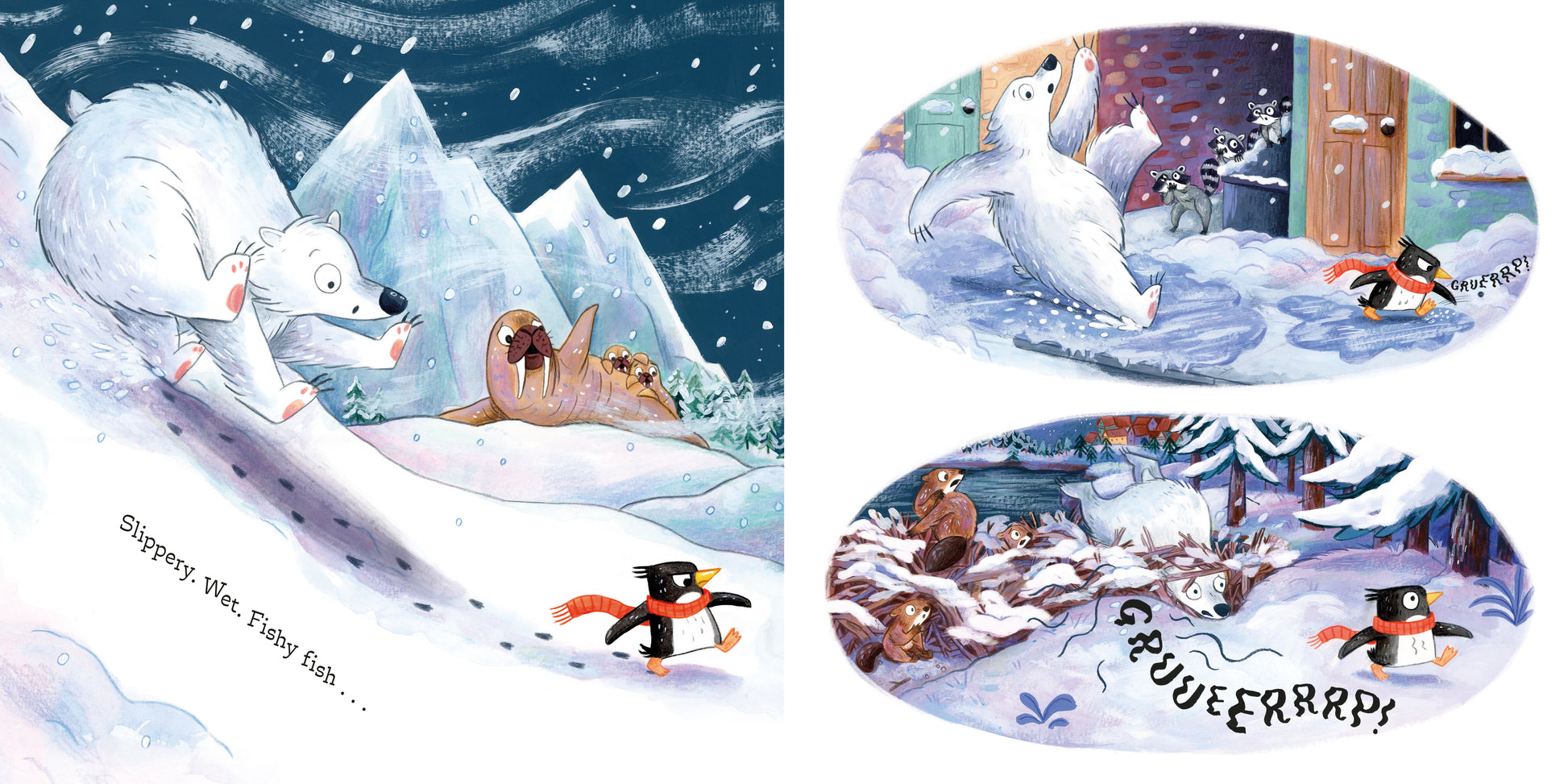 Meet a little penguin who is super hungry but totally bored of eating fish. An older penguin recalls hearing of a fluffy creature called a ‘bolar pear’, so the little penguin sets off on an adventurous mission to find and eat this ‘mystery’ creature.