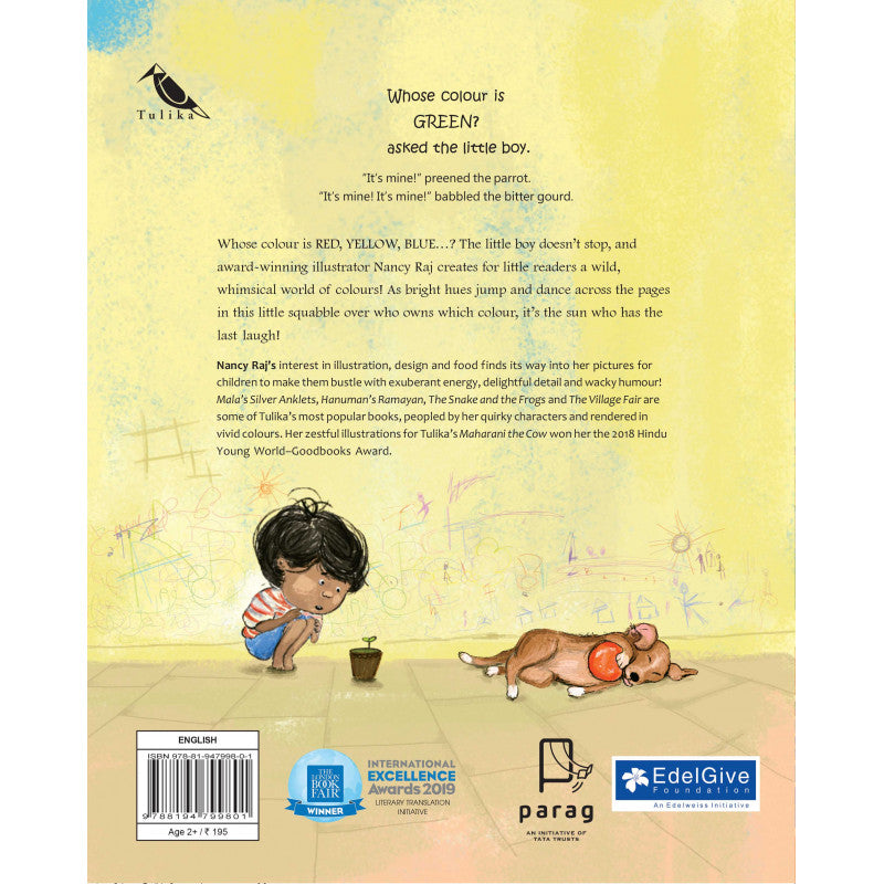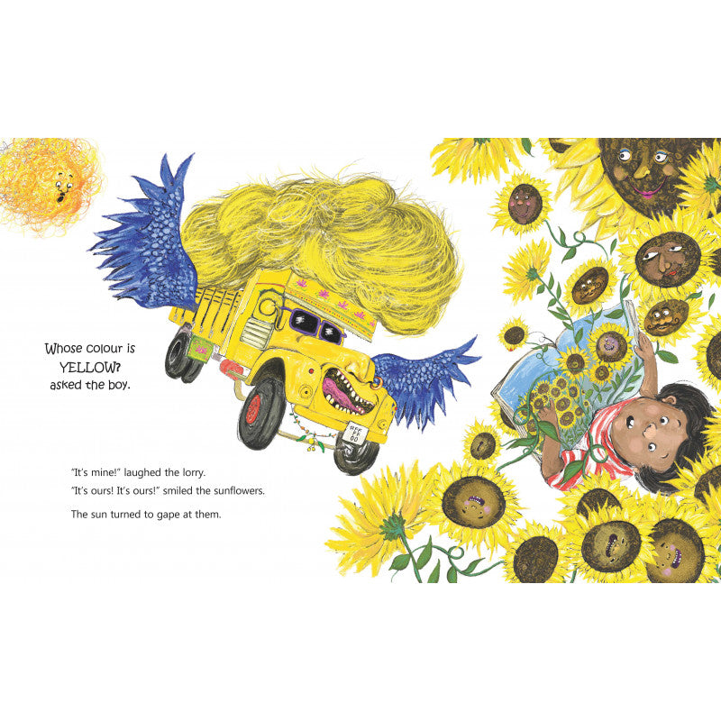 Whose colour is RED, YELLOW, BLUE…? The little boy doesn’t stop, and award-winning illustrator Nancy Raj creates for little readers a wild, whimsical world of colours! As bright hues jump and dance across the pages in this little squabble over who owns which colour, it’s the sun who has the last laugh!