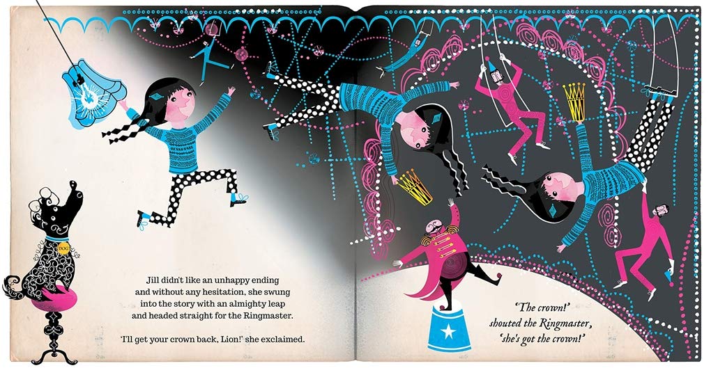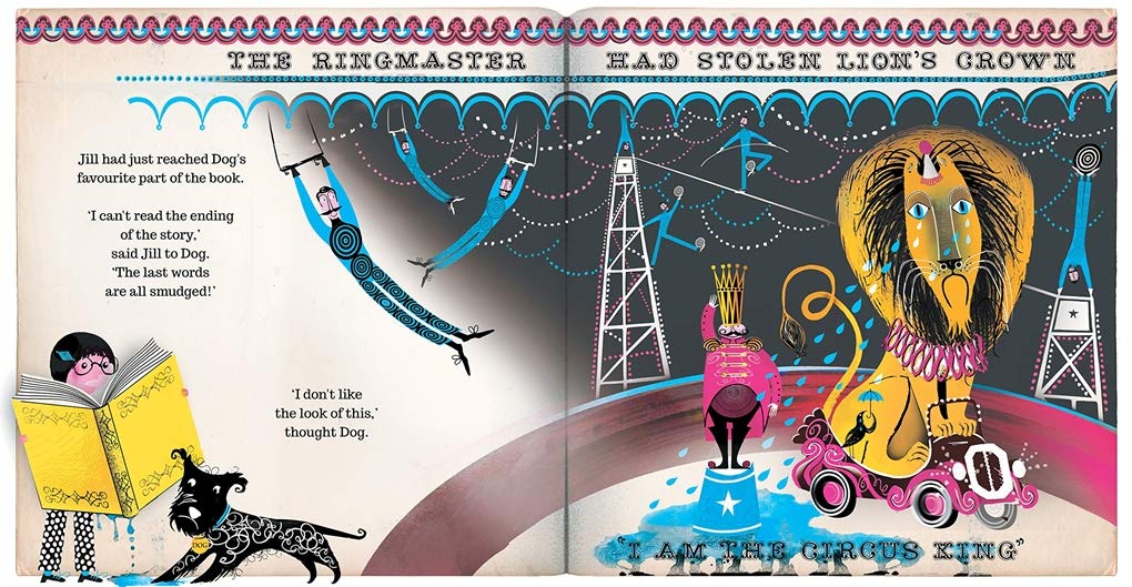 Reading a new picture book, Jill is horrified to discover a magnificent lion forced to join the circus and drive a toy car around in endless circles. Lion is so demoralised, his tears have started to blur the words of the story. Jill bravely decides to jump into the book and rescue Lion, landing in the middle of a particularly dangerous chapter. But with Dog at her side, nothing is too difficult for Jill to conquer, and she sets out to return Lion to his rightful place as king of the jungle.