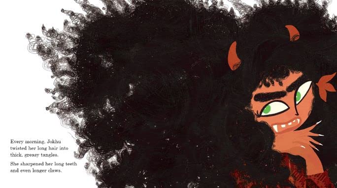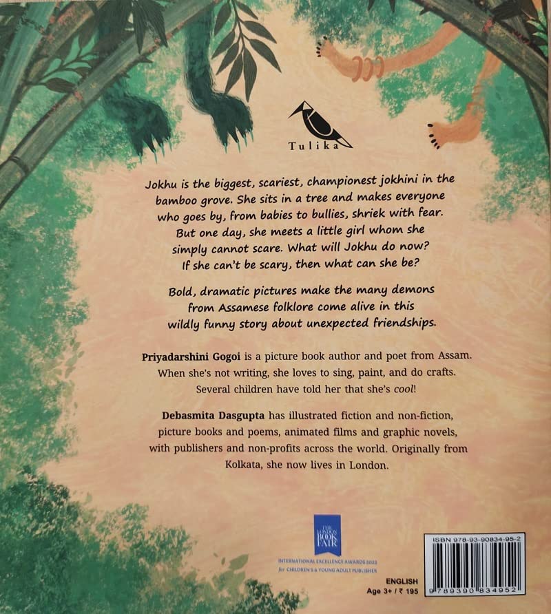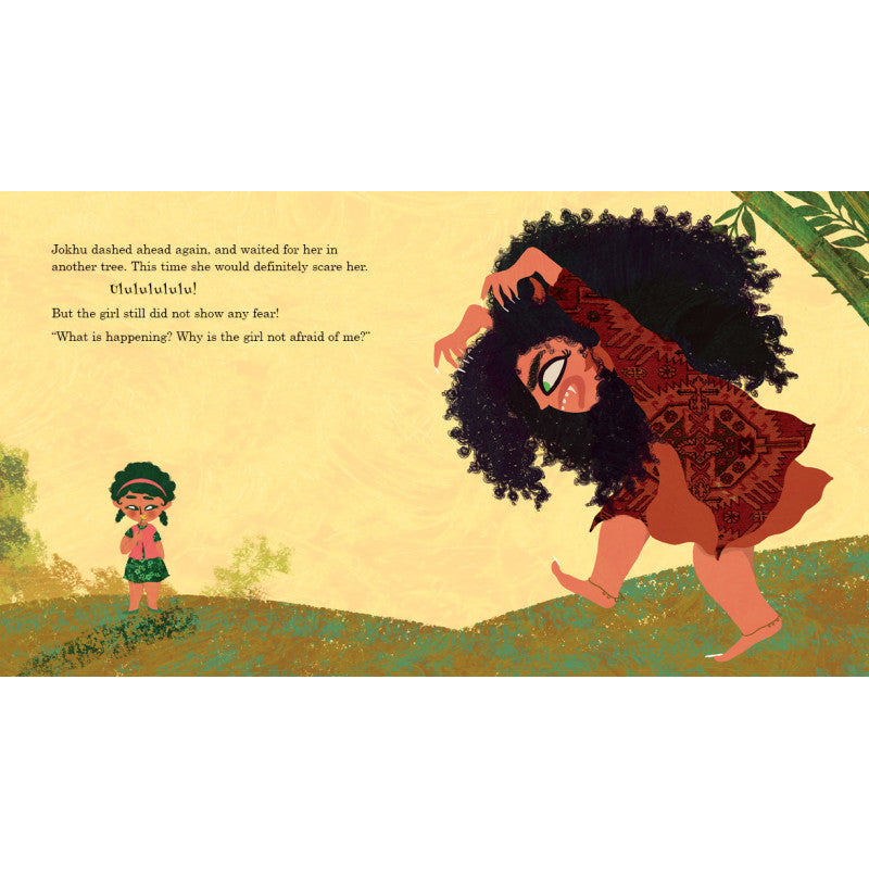 Jokhu is the biggest, scariest, championest jokhini in the bamboo grove. She sits in a tree and makes everyone who goes by, from babies to bullies, shriek with fear. But one day, she meets a little girl whom she simply cannot scare. What will Jokhu do now? If she can’t be scary, then what can she be?