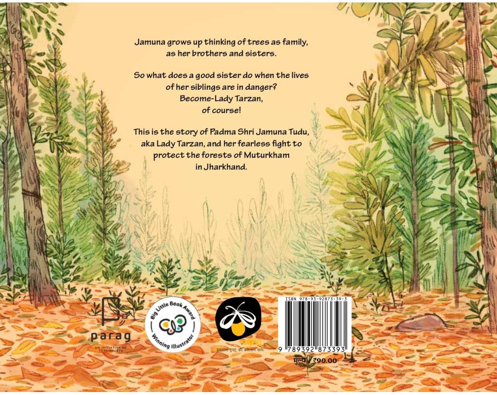 Lady Tarzan aka Jamuna Tudu put her life at stake to save forests. Her story is the story of struggle and love. Lavanya Karthik retells Lady Tarzan's story as a story of struggle and love. It asks, "Do we love something?" This question gives us hope as we can stand for someone we love. For support. Rajiv Eipe's illustrations gives sound to the story. The sounds of a healthy forest.