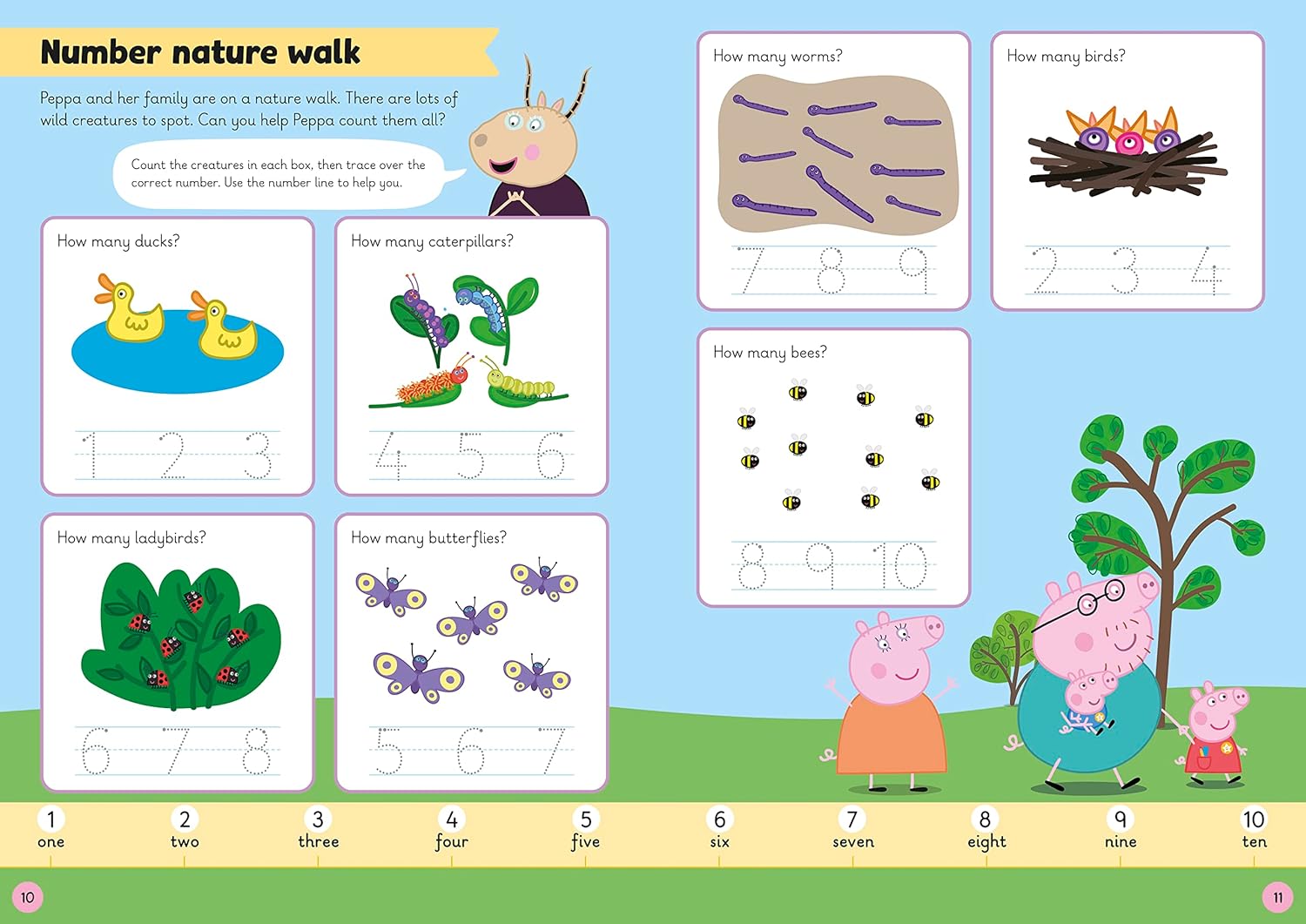 Learn with Peppa: Counting 0 to 20helps children build number recognition and learn to count. Gradually progressing in number practice from 0 to 10 to 11 to 20, children will gain confidence in writing numerals and counting in sequence, as well as grouping objects and finding the missing number. Count and write the number, then wipe the page clean and try again!