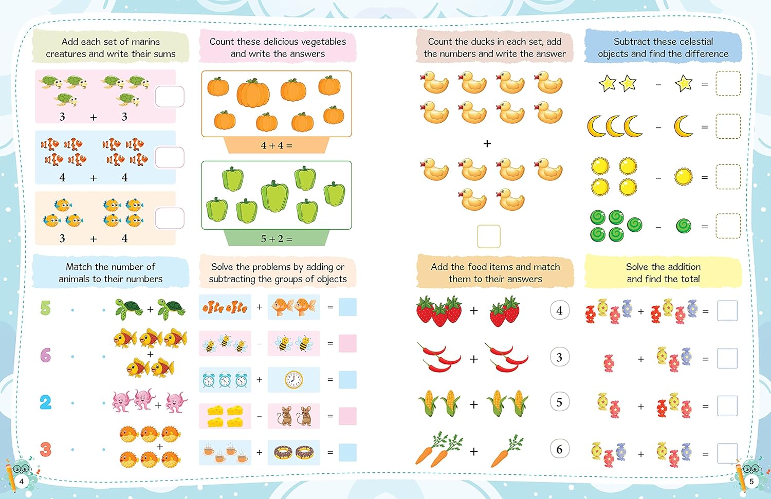 This math activity book provides an exciting start for early learners. Kids will encounter simple questions on adding and subtracting numbers. From counting objects to matching sums with their answers and solving problems, this book lays a strong foundation in the fundamentals of math. Whether in the market, in class or during playtime, kids will boost their confidence in counting. Let them explore the world of math through engaging activities!