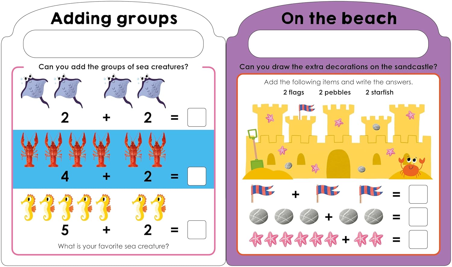 This board book has simple instructions and activities, and encourages young children to develop their reading, writing, and numeracy skills. Its handle shape and bold, colorful design make it a fun learning tool, and the wipe clean pages mean children can practice again and again. It even comes with its own dry-wipe pen.