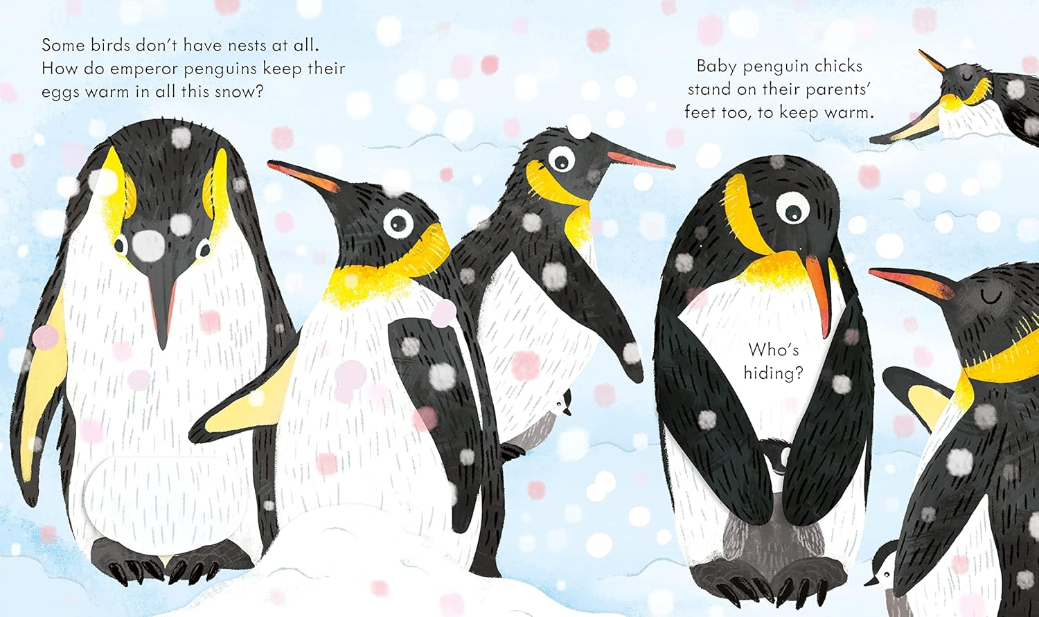 Peep inside a bird's nest to see her precious eggs nestled there. Lift a flap to see them hatch, and find out how a bird takes care of its young. Discover all kinds of different nests and chicks, from teeny-tiny humming birds nests to great big muddy flamingo nests, and even learn how penguins take care of their eggs in the snow without a nest at all.