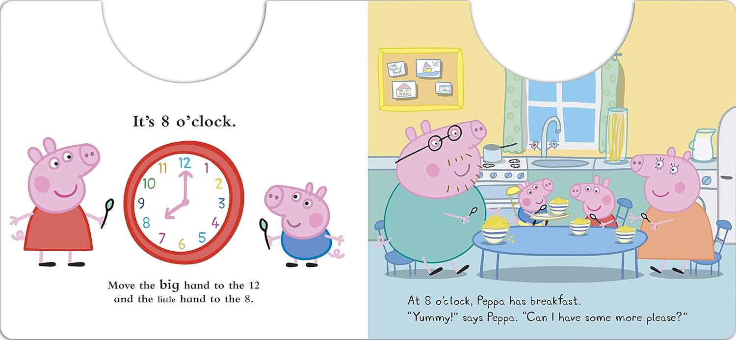 Tick-tock, tick-tock, it's Peppa and George's clock! Read the story and join Peppa and George on their very busy day, turning the clock hands as you go. This delightful children's novelty book is perfect bedtime reading and features Peppa Pig and your favourite characters from the show.