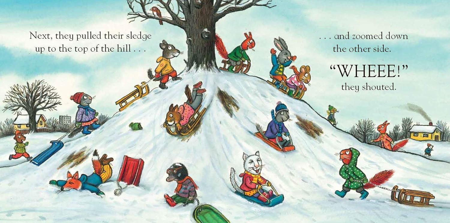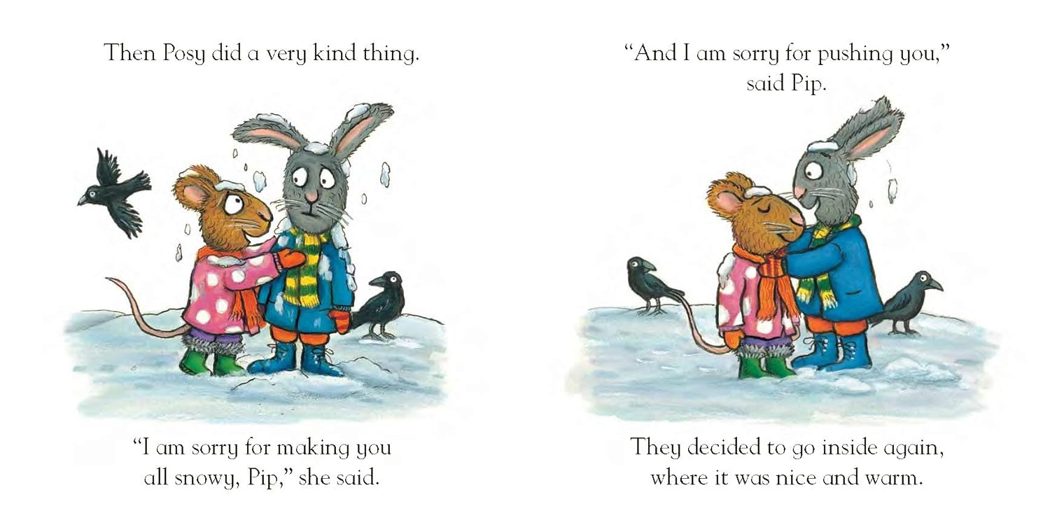It's a beautiful snowy day and Pip and Posy can't wait to go out and play. They have all sorts of fun, until they decide to build a snowman, when things start to go a bit pear-shaped. Pip wants a snow RABBIT, but Posy wants a snow MOUSE! An argument erupts and very soon both friends are cold and wet - and very sad. Oh dear! Happily the friends resolve their differences over a cosy craft sessions indoors.