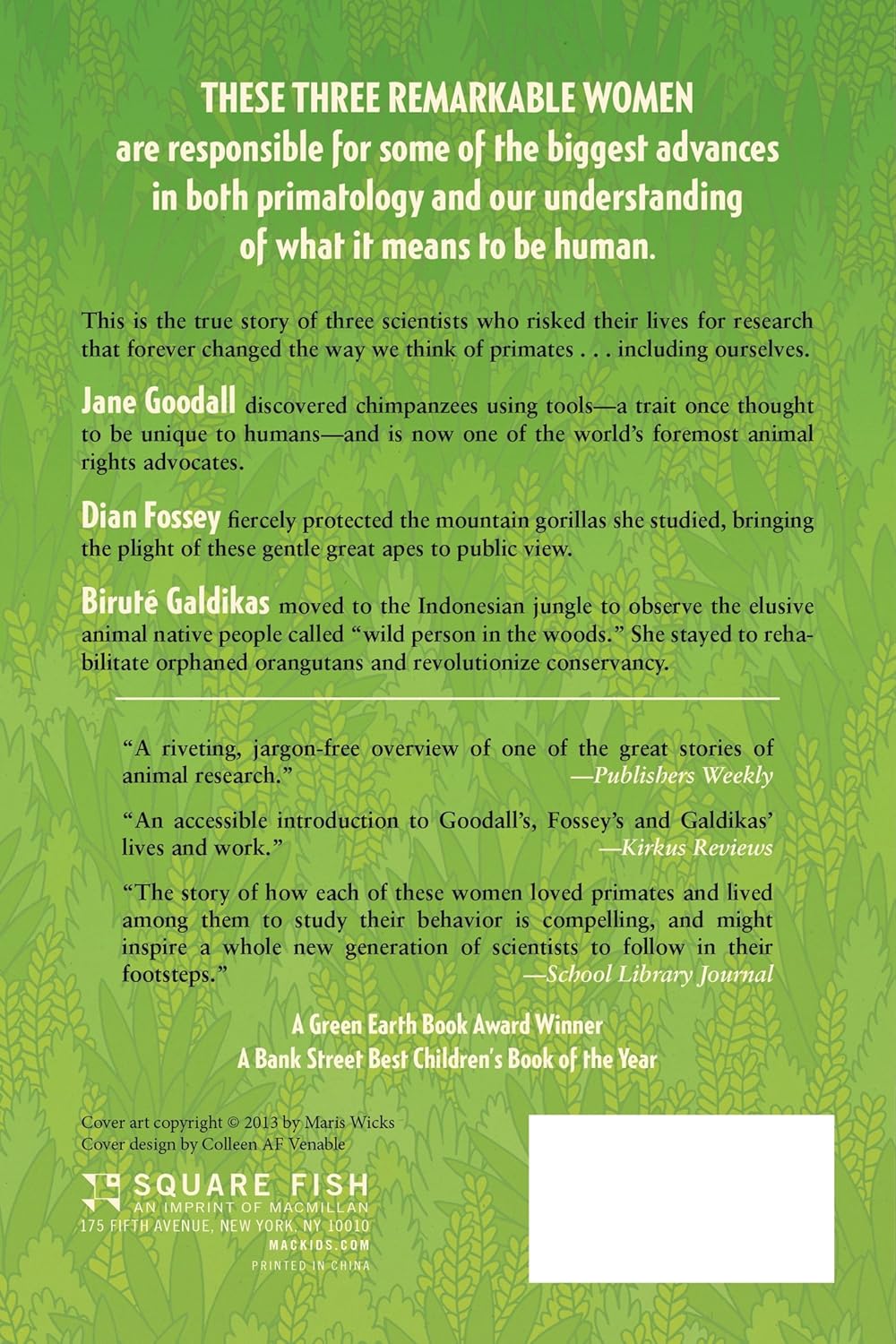 Tackling Goodall, Fossey, and Galdikas in turn, and covering the highlights of their respective careers, Primates is an accessible, entertaining, and informative look at the field of primatology and at the lives of three of the most remarkable women scientists of the twentieth century. Thanks to the charming and inviting illustrations by Maris Wicks, this is a nonfiction graphic novel with broad appeal.