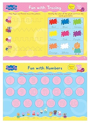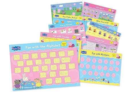 Jump up and down the muddles with Peppa and her friends at the school! This set of fun, wipe-&-clean activity mats is packed with activities and puzzles for the little ones to enjoy. Toddlers can solve the puzzles and learn concepts like letters of the English alphabet, opposite words, shapes, numbers and more. This playful set of activity mats is great for vocabulary development and improving concentration.