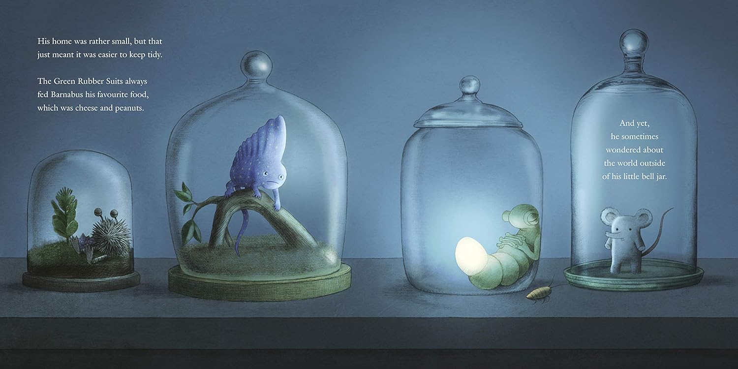 They are all Failed Projects. Barnabus has never been outside his tiny bell jar, yet he dreams of one day seeing the world above ground that his pal Pip the cockroach has told him about: a world with green hills and trees, and buildings that reach all the way to the sky, lit with their own stars.