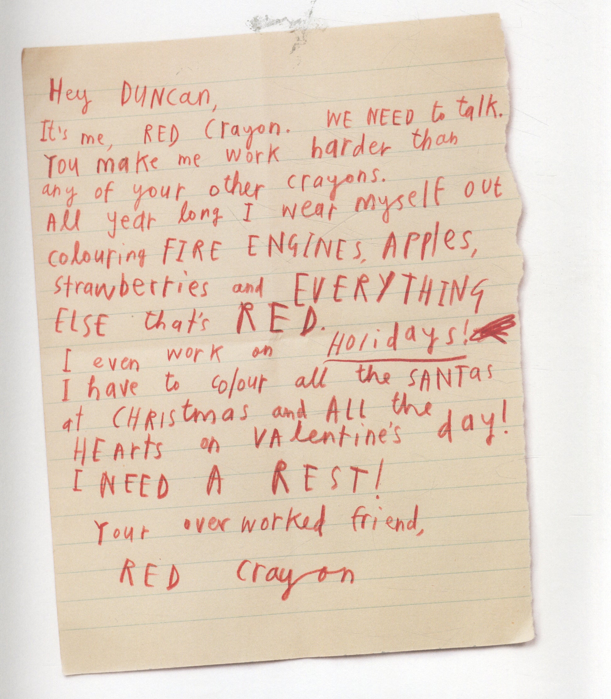 Poor Duncan just wants to colour in. But when he opens his box of crayons, he only finds letters, all saying the same thing: We quit! Beige is tired of playing second fiddle to Brown, Blue needs a break from colouring in all that water, while Pink just wants to be used. Green has no complaints, but Orange and Yellow are no longer speaking to each other. The battle lines have been drawn. What is Duncan to do?