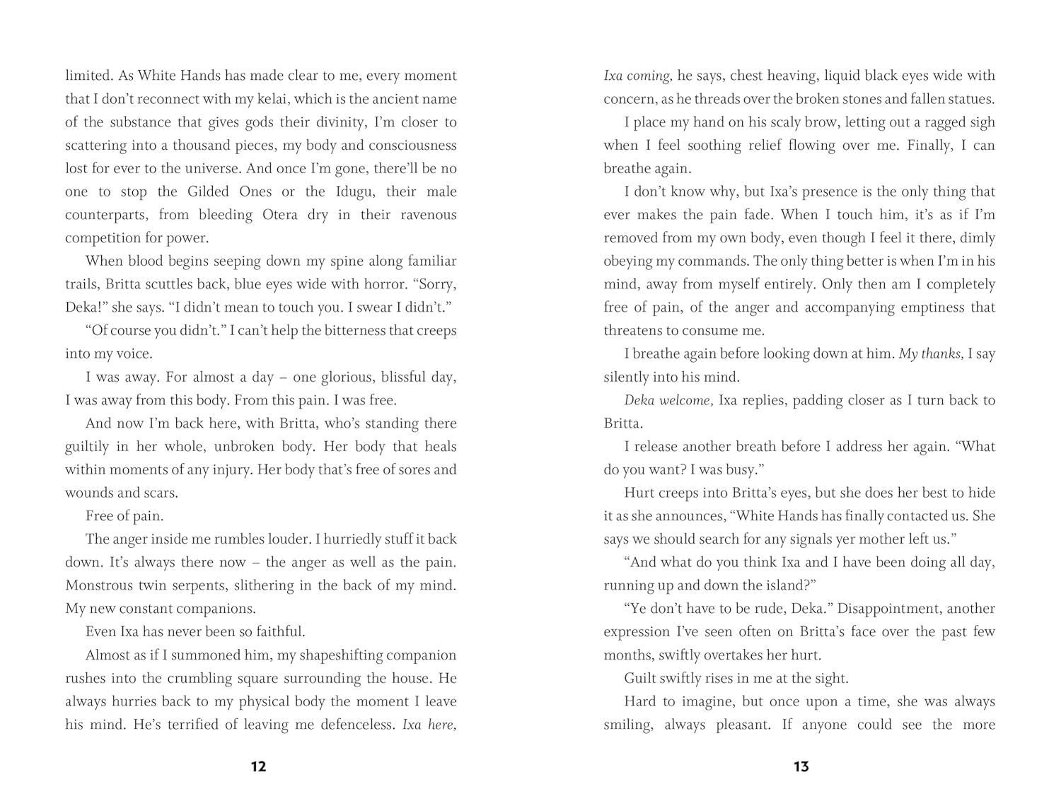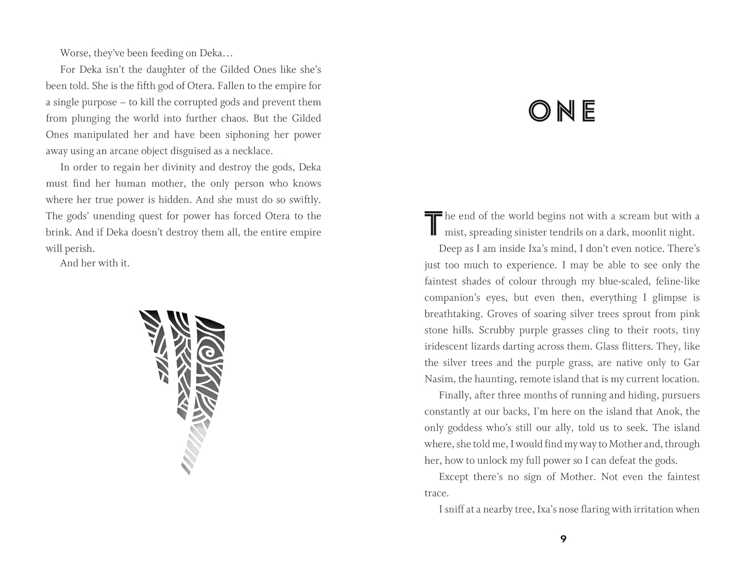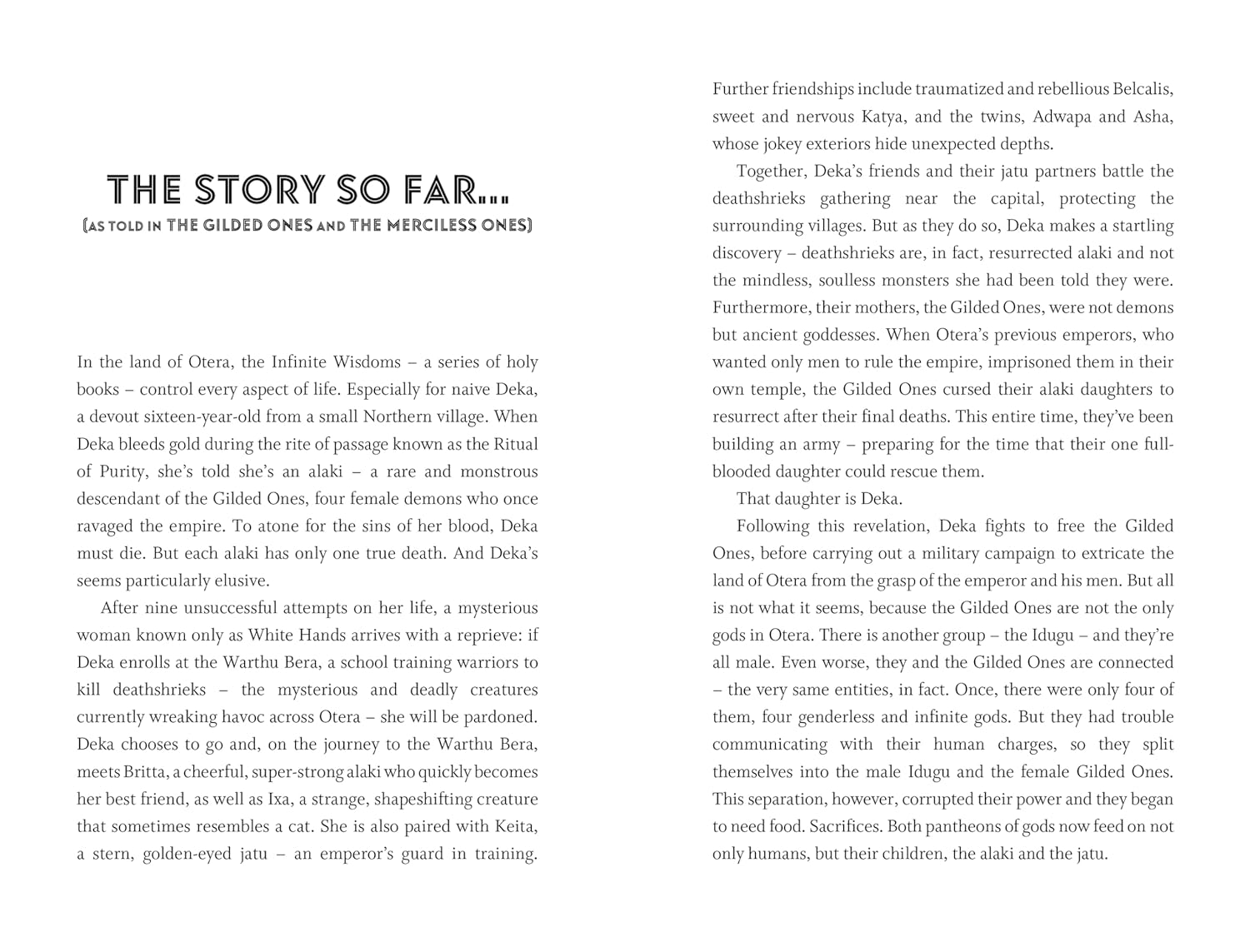 Mere weeks after confronting the Gilded Ones—the false beings she once believed to be her family—Deka is on the hunt. In order to kill the gods, whose ravenous competition for power is bleeding Otera dry, she must uncover the source of her divinity. But with her mortal body on the verge of ruin, Deka is running out of time—to save herself and an empire that’s tearing itself apart at its seams.