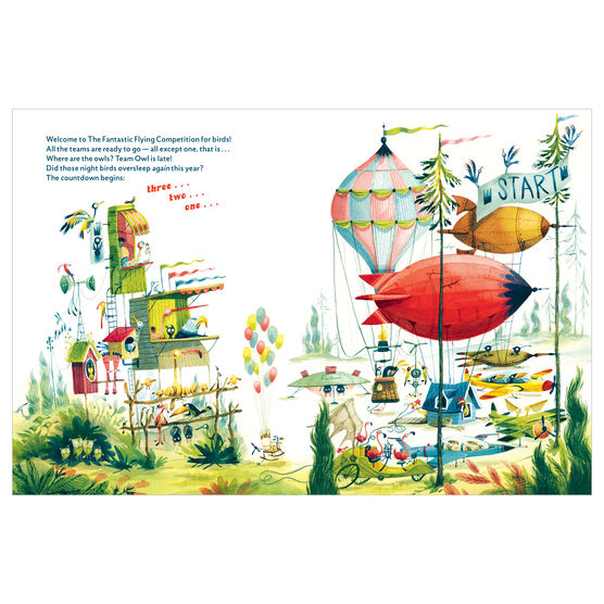 Welcome to the Fantastic Flying Competition for birds! All the teams are ready to go, all except one, that is . . . Where are the owls? Team Owl is late! Did those night birds oversleep again this year? The countdown begins: three . . . two . . . one . . . In this gorgeous, wacky story, readers can join a motley menagerie of hawks, chickens, owls, bats, toucans, and many more flying animals as they all compete to be the winner of the Fantastic Flying Competition! With every flying contraption under the sun, whose invention will take them to the finish line and who will be trailing behind?