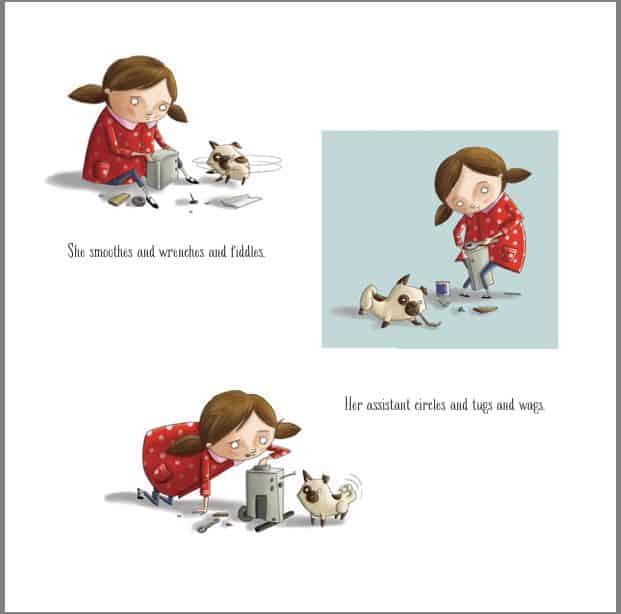 She knows just how it will look. She knows just how it will work. All she has to do is make it, and she makes things all the time. But making her magnificent thing is anything but easy, and the girl tries and fails, repeatedly. Eventually, the girl gets really, really mad. She is so mad, in fact, that she quits. But after her dog convinces her to take a walk, she comes back to her project with renewed enthusiasm and manages to get it just right.