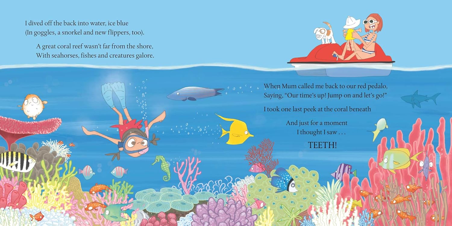 Flip flops, snorkels and goggles aren't the only things that one little girl has brought with her on her summer holiday . . . There's also something with big white, jagged teeth that is sure to make this trip even more memorable! What COULD it be?