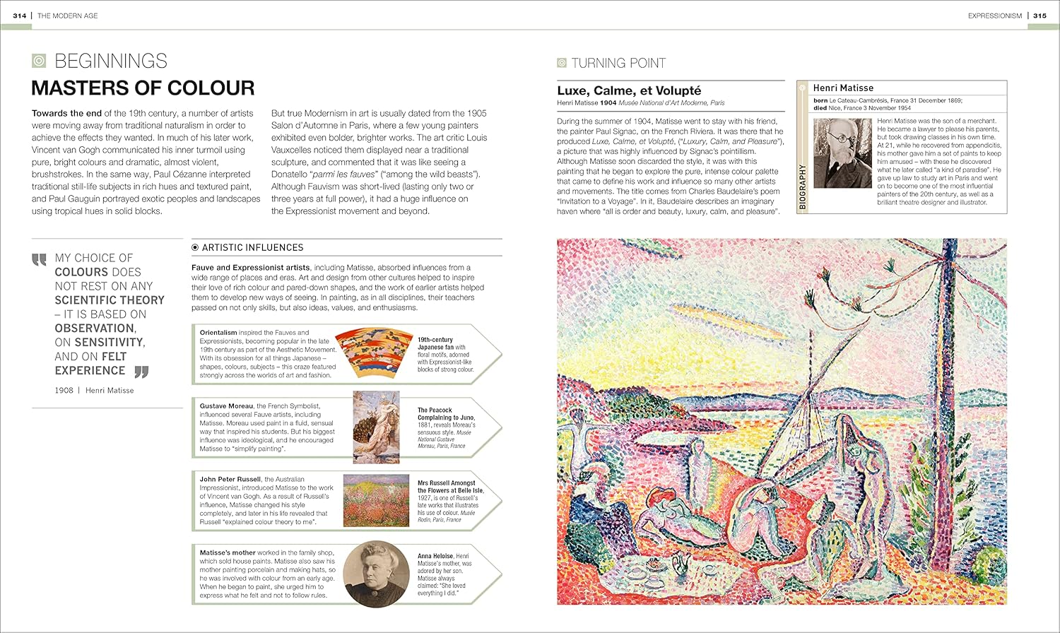 Timelines of Art provides detailed analysis of the works of key artists, showing details of their technique - such as Leonardo's use of light and shade. It tells the story of avant-garde works like Manet's Le Déjeuner sur l'herbe (Lunch on the Grass), which scandalised society, and it traces how certain artists, genres or movements informed the works of others - showing how the Impressionists were inspired by Gustave Courbet, for example, or how Van Gogh was influenced by Japanese prints.