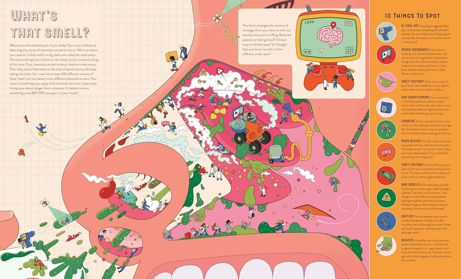 But it's not all a biology lesson: look closely through the magnifying glass, and you'll find scared scientists fleeing from a tastebud-tingling chilli pepper, an ear-canal waterslide, and even a cinema inside an eyeball! Your trusty magnifying glass will reveal new gags again and again among the scrapes, mishaps and wacky experiments of the miniature scientists, where every tiny detail tells a story, and every story reveals more incredible facts about the human body.