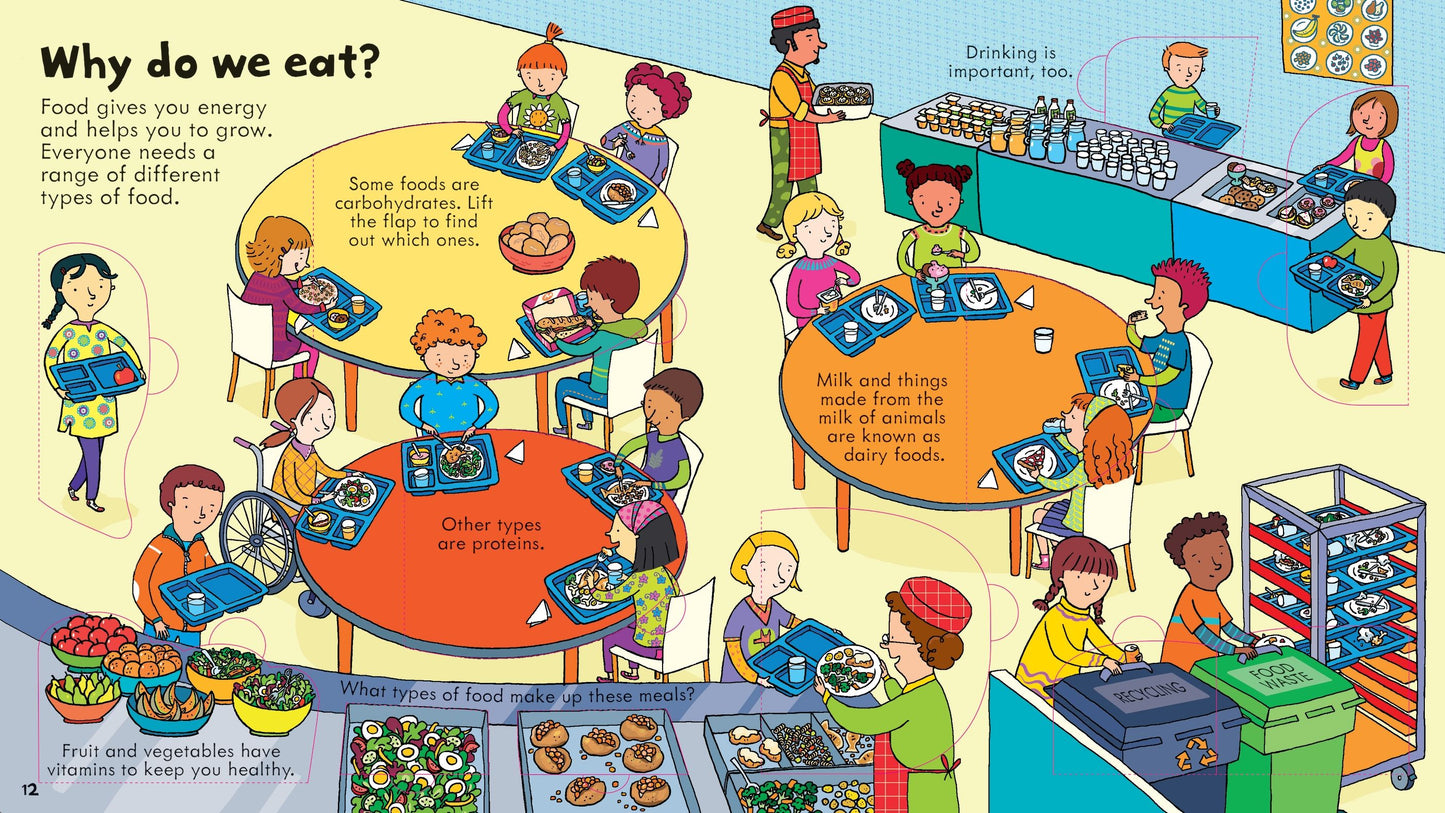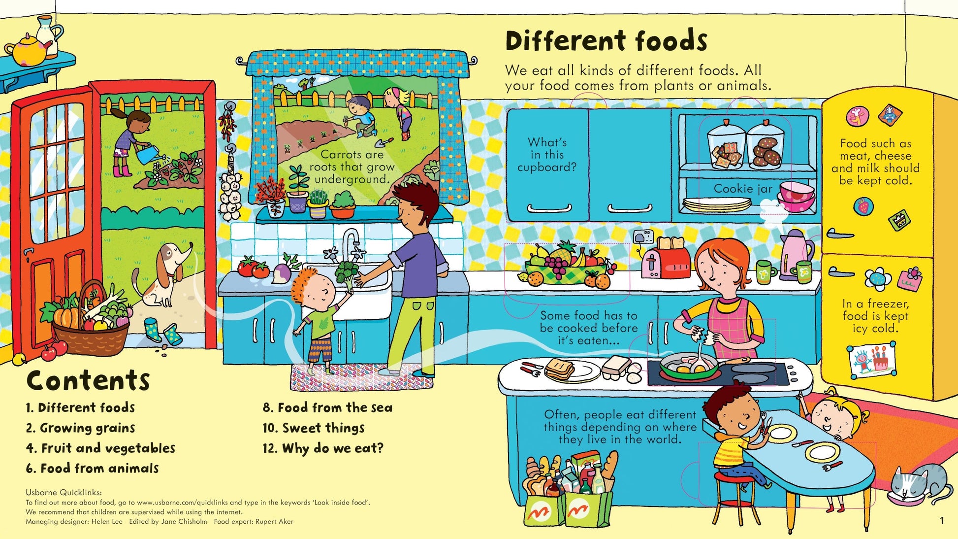 Little children can find out all about where the food they eat comes from in this colourful lift-the-flap book. Lift the flaps to look inside kitchen cupboards and a refrigerator, watch fields being sown with rice and wheat and see cows being milked on a farm. With special pages on farm animals, food from the sea and why we need to eat a balanced diet. A lovely introduction to food from farm to fork for young children.