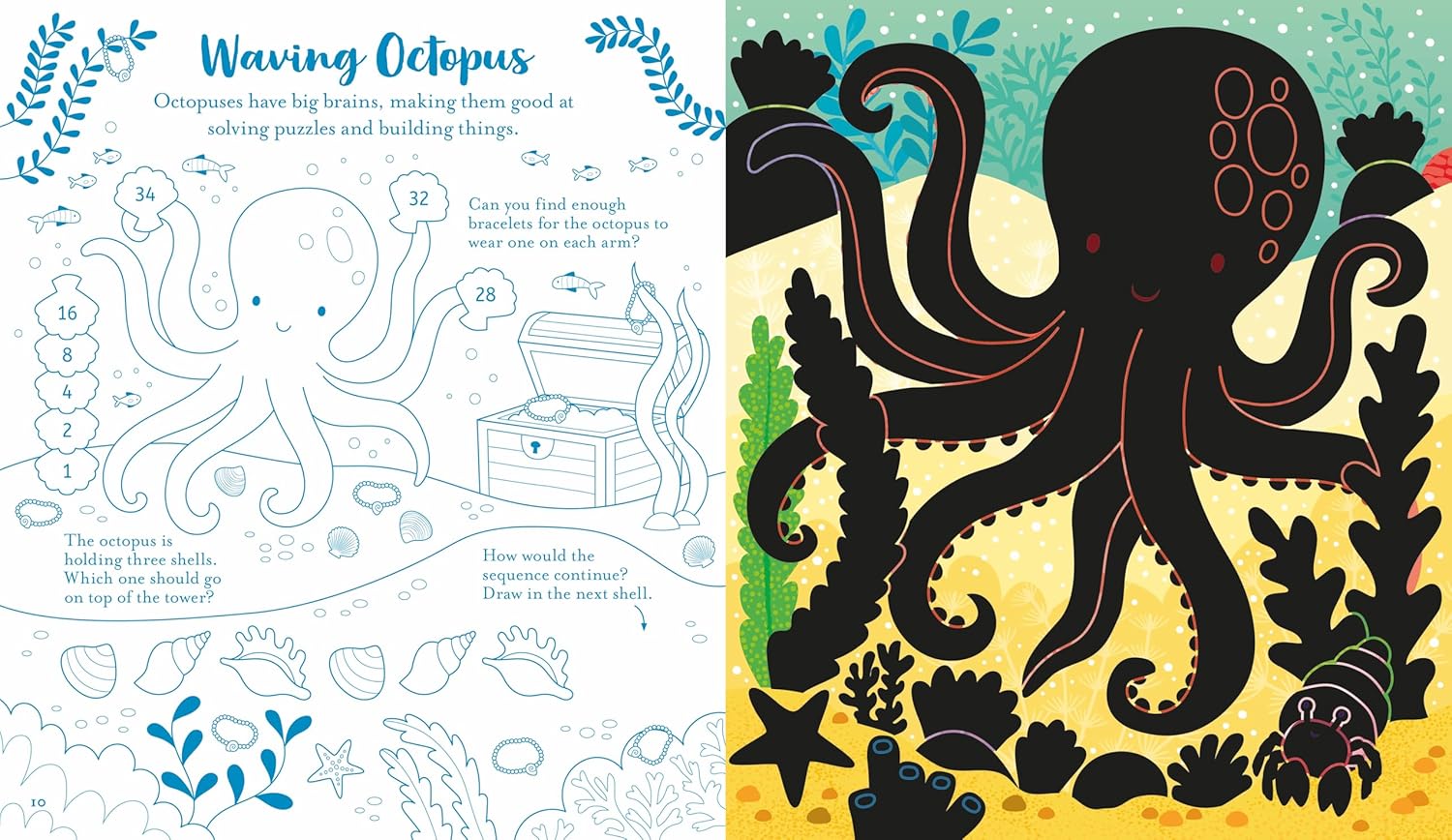 - Every scratch art page has a facing page of ocean-themed colouring and puzzles.