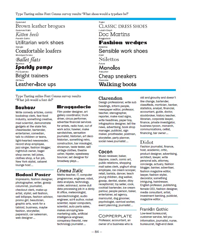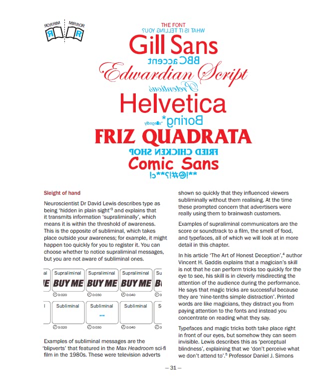 This book opens up the science and the art behind how fonts influence you. It explains why certain fonts or styles evoke particular experiences and associations. Fonts have different personalities that can create trust, mistrust, give you confidence, make things seem easier to do or make a product taste better. They're hidden in plain sight, they trigger memories, associations and multisensory experiences in your imagination.