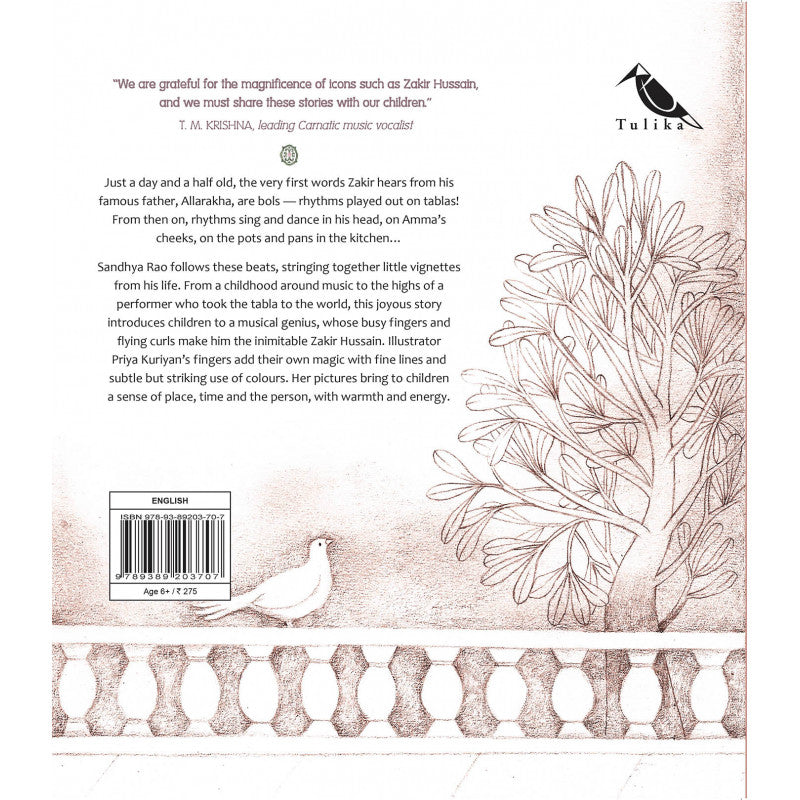 Just a day and a half old, the very first words Zakir hears from his famous father, Allarakha, are bols — rhythms played out on tablas! From then on, rhythms sing and dance in his head, on Amma’s cheeks, on the pots and pans in the kitchen…